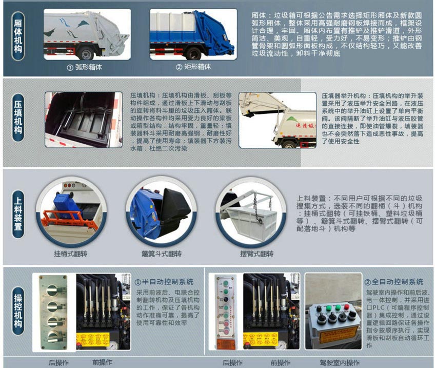 Body configuration: New rib-free box, beautiful and generous plane arc, effective compression volume of 4 cubic meters, flipping loading mechanism at the tail, electronically controlled manual dual control system, dual control boxes in the cab and the rear of the car, with a 3 cm rear belt at the rear Rubber sealing strip, with sewage collection tank, large-capacity sewage tank, the box can be spray-painted with patterns and words as required.